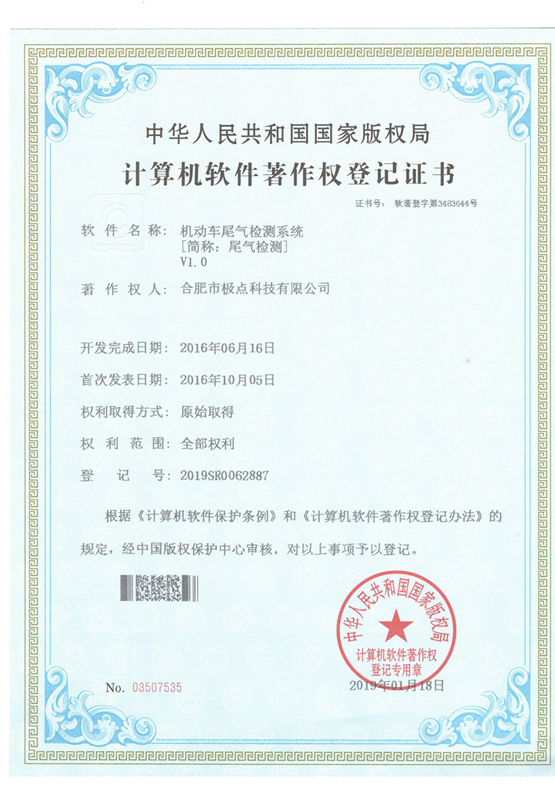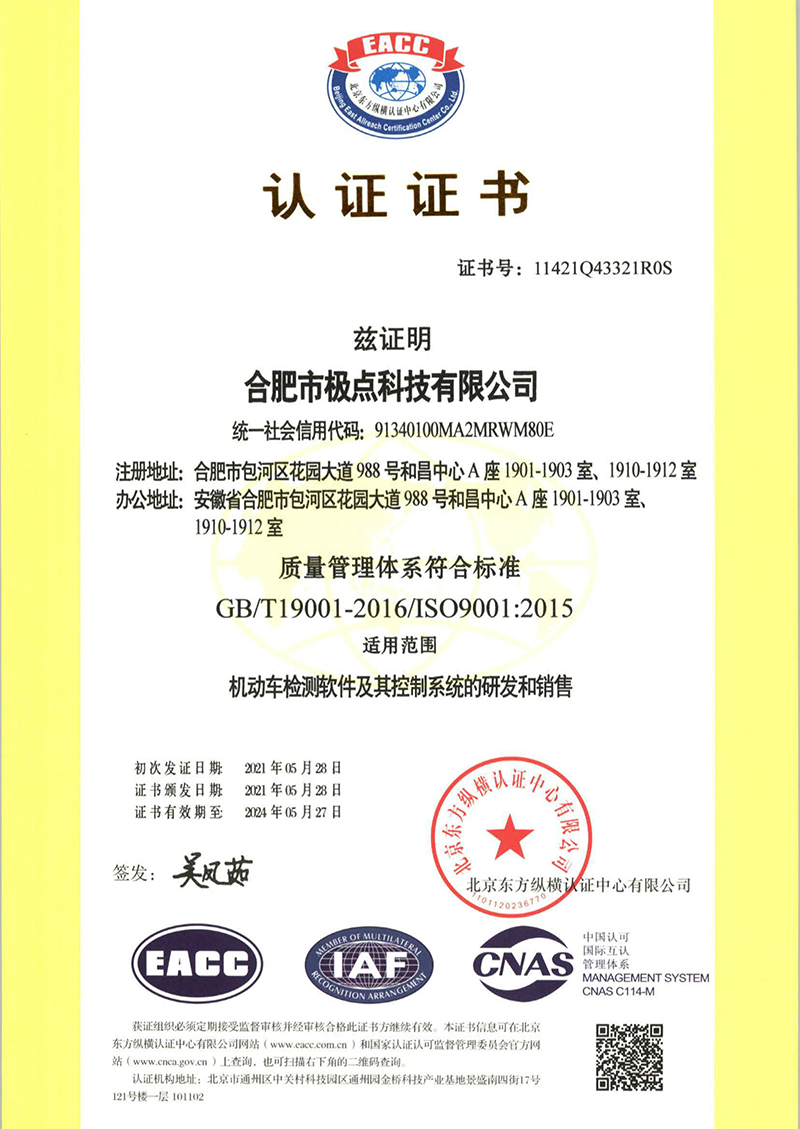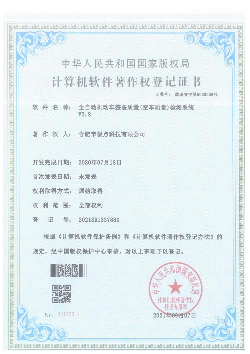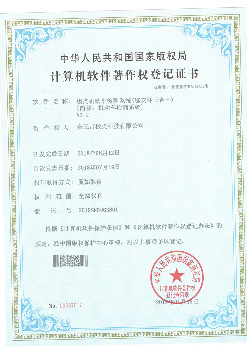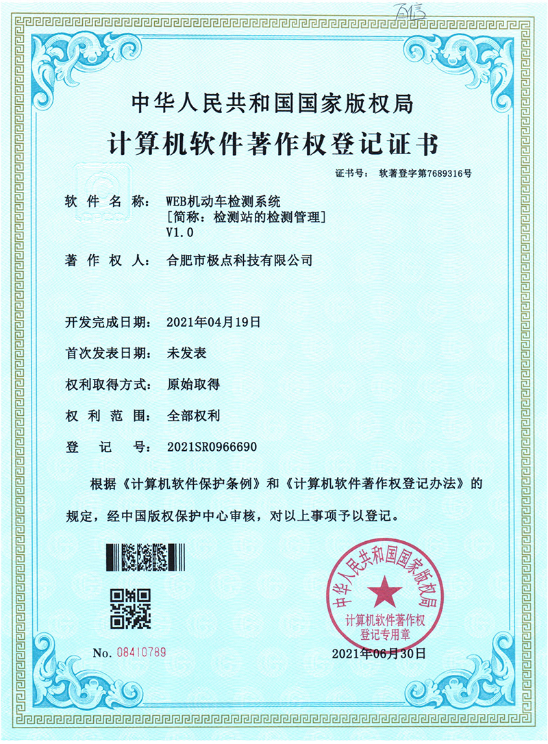 合肥市極點科技有限公司位于科教名城合肥市。是一家專注于機動車檢測系統(tǒng)的研發(fā)與銷售的高科技公司。產(chǎn)品涵蓋機動車檢測設(shè)備、圖像識別、人工智能、環(huán)保檢測、工業(yè)自動化等方面,廣泛應(yīng)用于公安、環(huán)保、交通、教育、汽車生產(chǎn)與維護等領(lǐng)域。公司產(chǎn)品擁有多項發(fā)明專利和實用新型專利以及數(shù)十項軟件著作權(quán)。