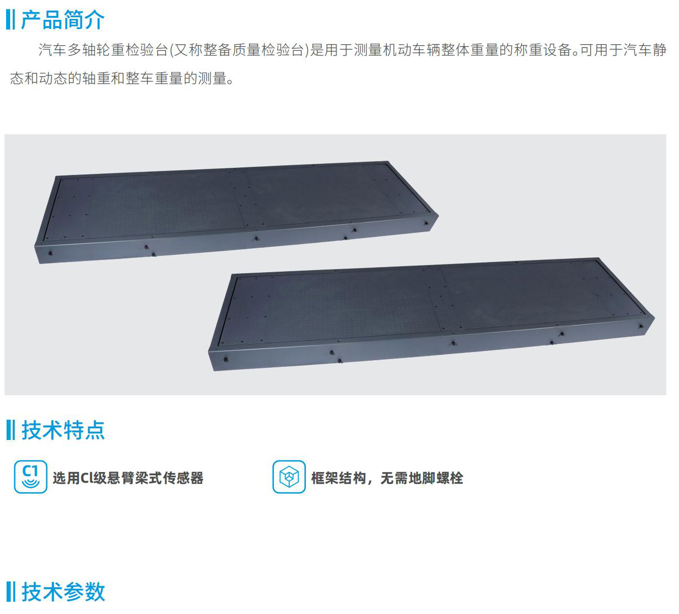 汽車(chē)多軸輪重檢驗(yàn)臺(tái)(又稱(chēng)整備質(zhì)量檢驗(yàn)臺(tái))是用于測(cè)量機(jī)動(dòng)車(chē)輛整體重量的稱(chēng)重設(shè)備。可用于汽車(chē)靜態(tài)和動(dòng)態(tài)的軸重和整車(chē)重量的測(cè)量。